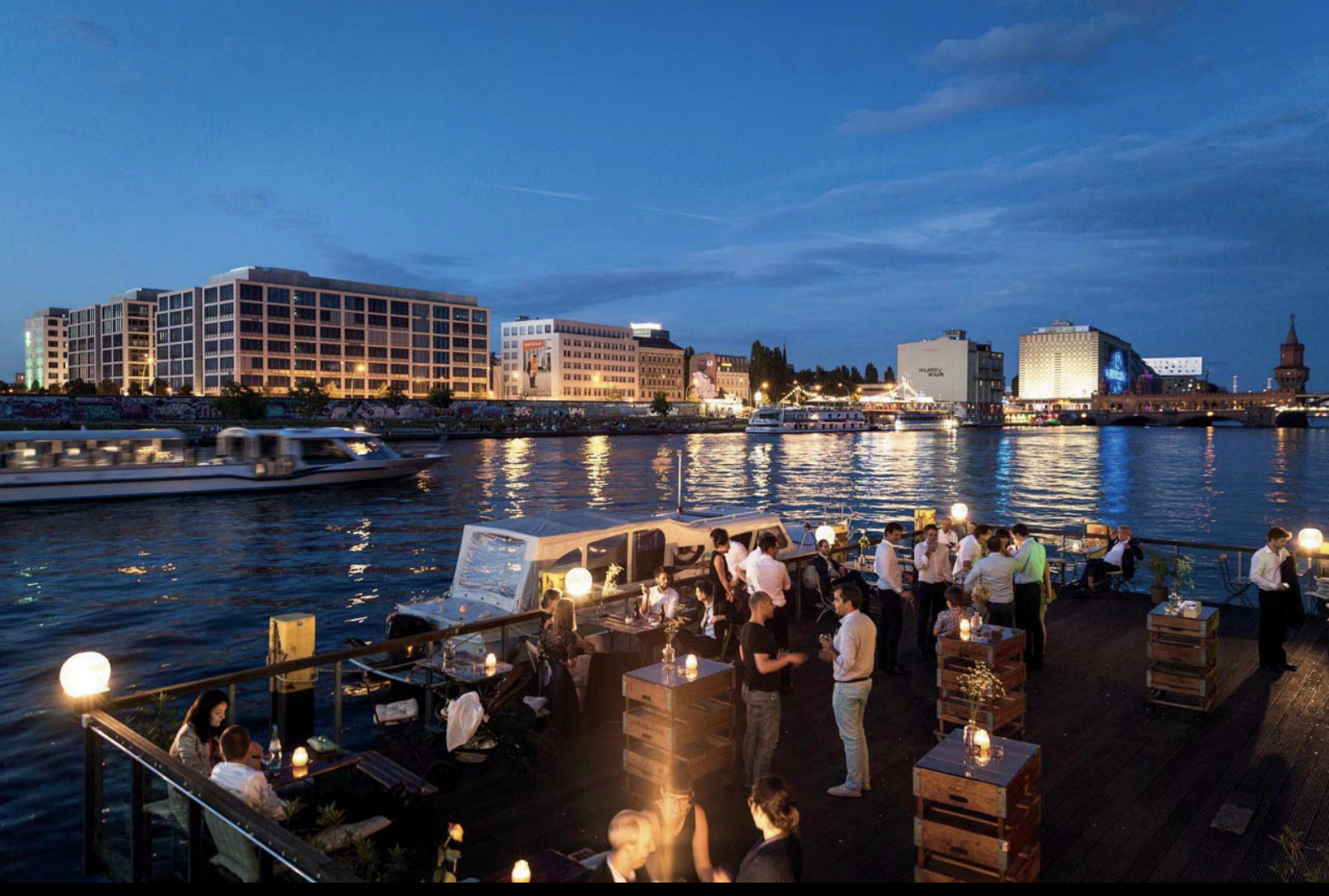 Die Terrasse auf der Spree bietet mitten im belebten Kreuzberg die Möglichkeit für unvergessliche Momente und Blick auf den schönsten Sonnenuntergang der Stadt.