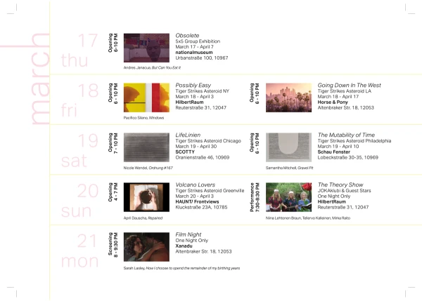 Das internationale Kunstnetzwerk Tiger Strikes Asteroid kündigt 5x5 an. Die neue Ausstellungsserie widmet sich der Förderung von Kommunikation zwischen Kulturen und erkundet Austausch, Kreativität, Erfindung und kulturelle Auswirkung auf von Kunstschaffenden geführten Räume - in diesem Falle in Berlin.