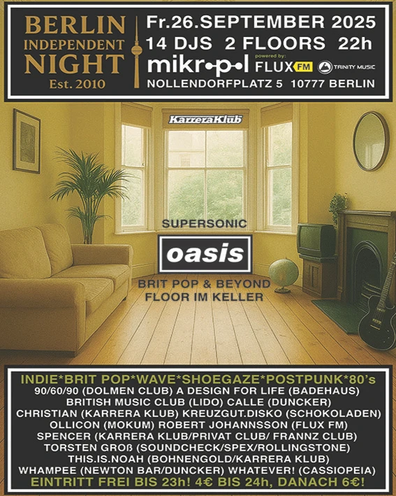 Diesmal erstmal ohne Bands und Livemusik. Aber dafür mit einem super Line Up der für uns zum Teil relevantesten 14 Indie DJs der Stadt, auf zwei Floors am Nollendorfplatz im neuen Club Mikropol. Fast der Ort an dem 1994 Oasis ihr erstes Konzert in Berlin gaben. Und da Oasis auch wieder am Werk sind haben wir uns gedacht, dass wir zur Feier des Tages einen der beiden Floors mit extra Oasis typischen Supersonic Brit Pop Sound im Keller versehen.