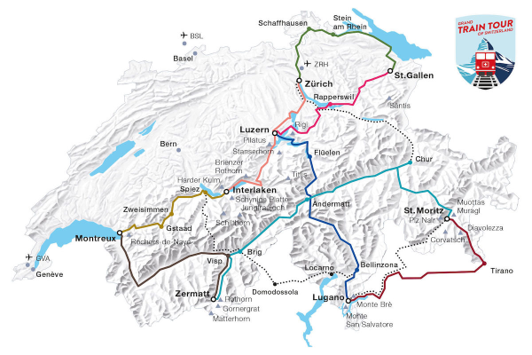 Mit der Grand Train Tour of Switzerland bereist ihr die schönsten Panoramastrecken der Schweiz bequem mit dem Zug: 1.280 Kilometer, vorbei an allen Highlights und Sehenswürdigkeiten, 11 großen Seen, 5 UNESCO Welterbstätten und atemberaubende Naturlandschaften. Es gibt keine festgelegte Route oder Dauer - ihr steigt da aus, wo es euch gefällt! Ganz stressfrei, egal ob mit Bahn, Bus, Schiff oder Bergbahn - und das alles mit nur einem Ticket, dem Swiss Travel Pass!